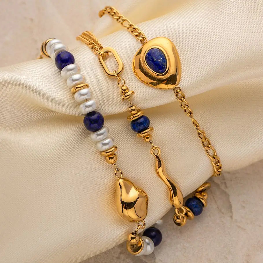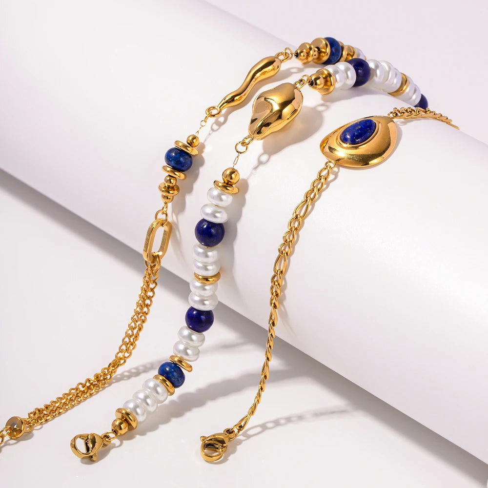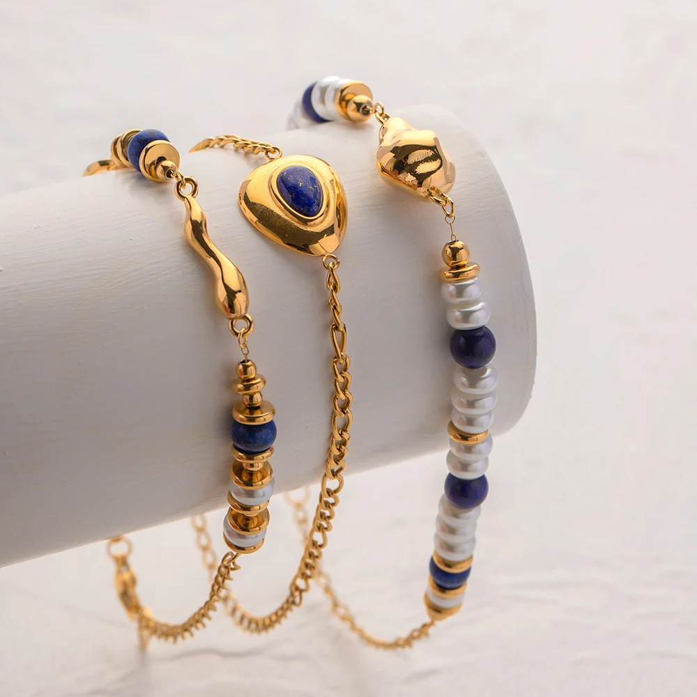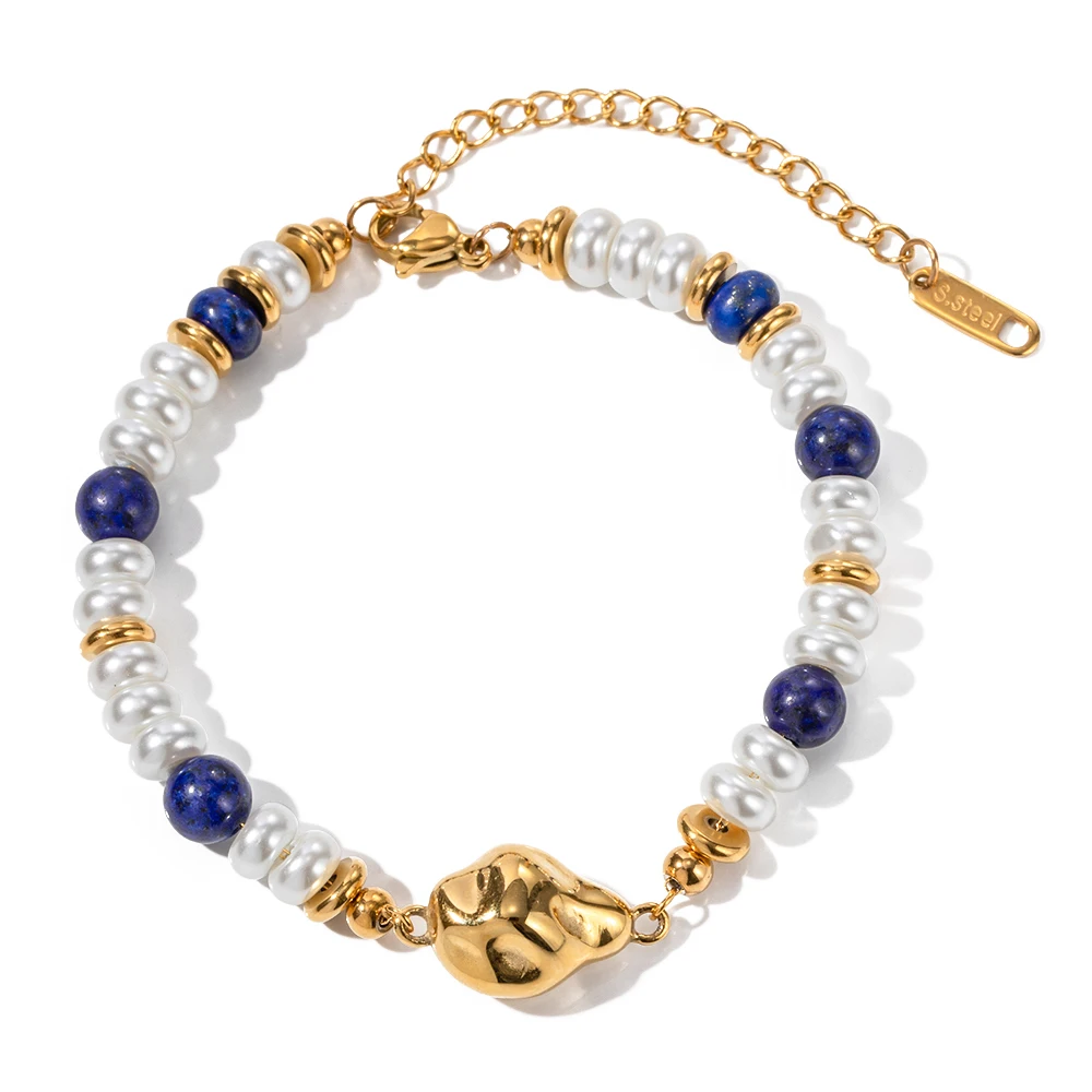 B003 Uworld Natural Stone lapis lazuli Pearl Handmade Stainless Steel 18K Gold Color Plating Link Bracelet Bangle Fashion Trendy Char