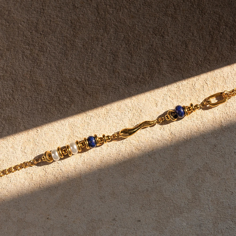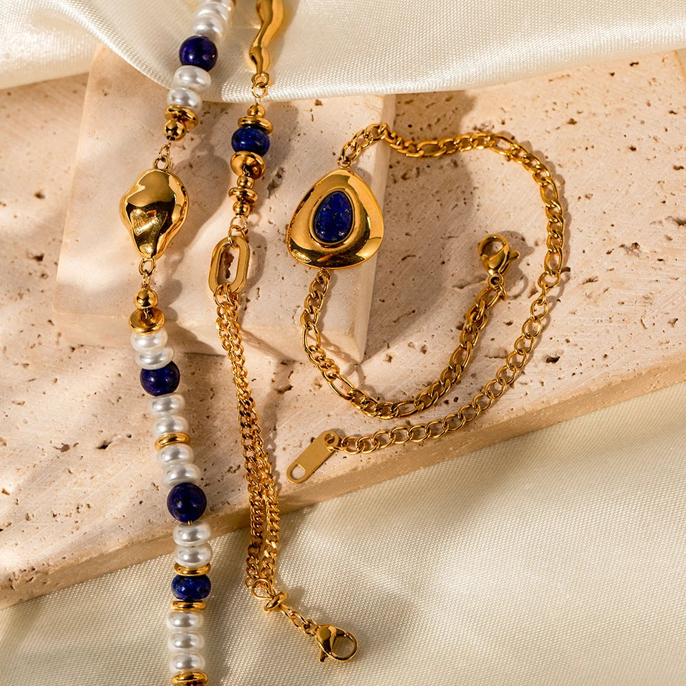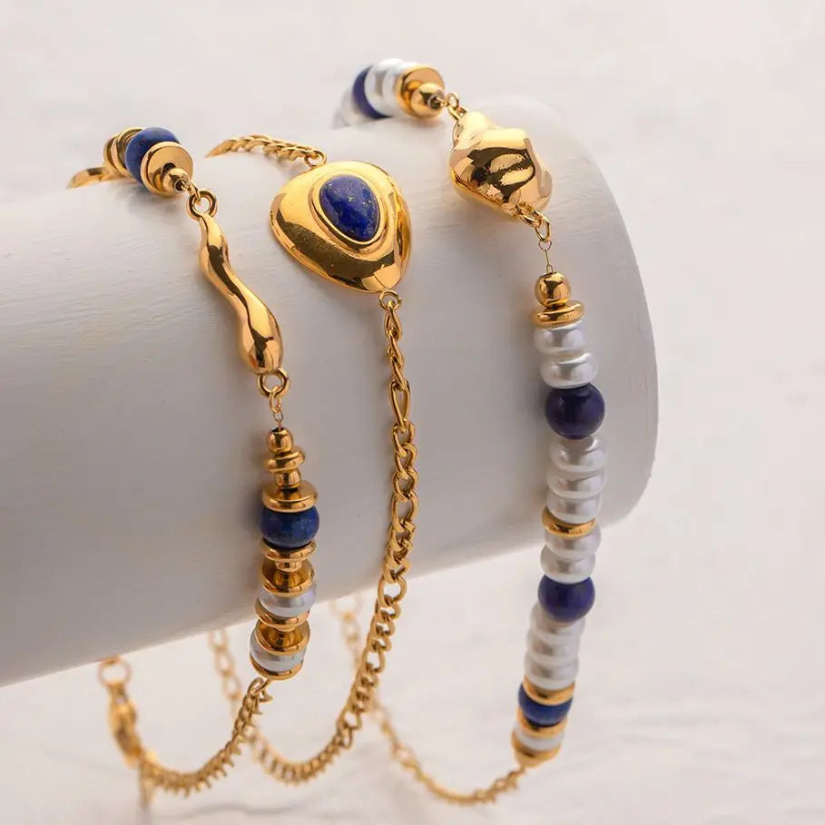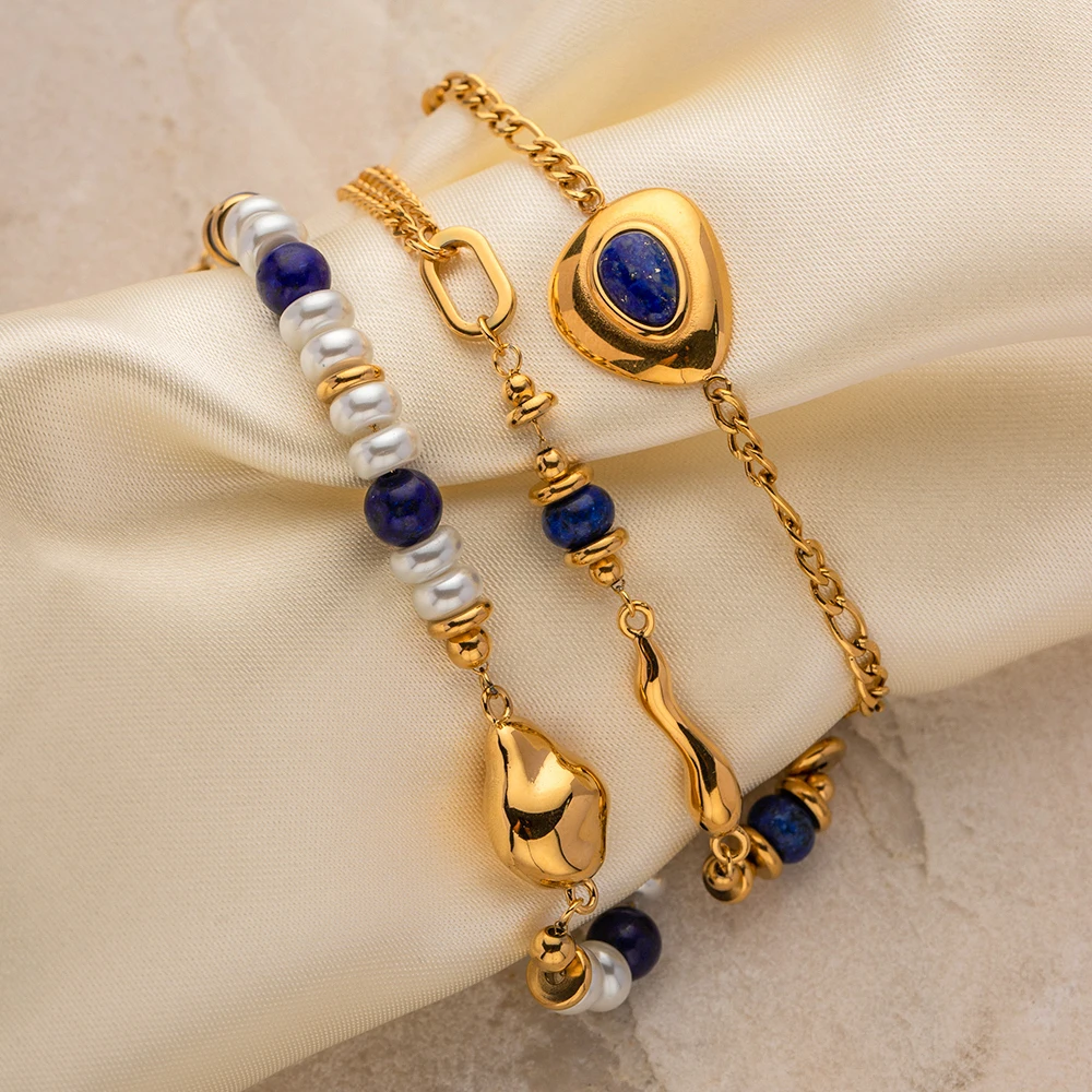 B003 Uworld Natural Stone lapis lazuli Pearl Handmade Stainless Steel 18K Gold Color Plating Link Bracelet Bangle Fashion Trendy Char