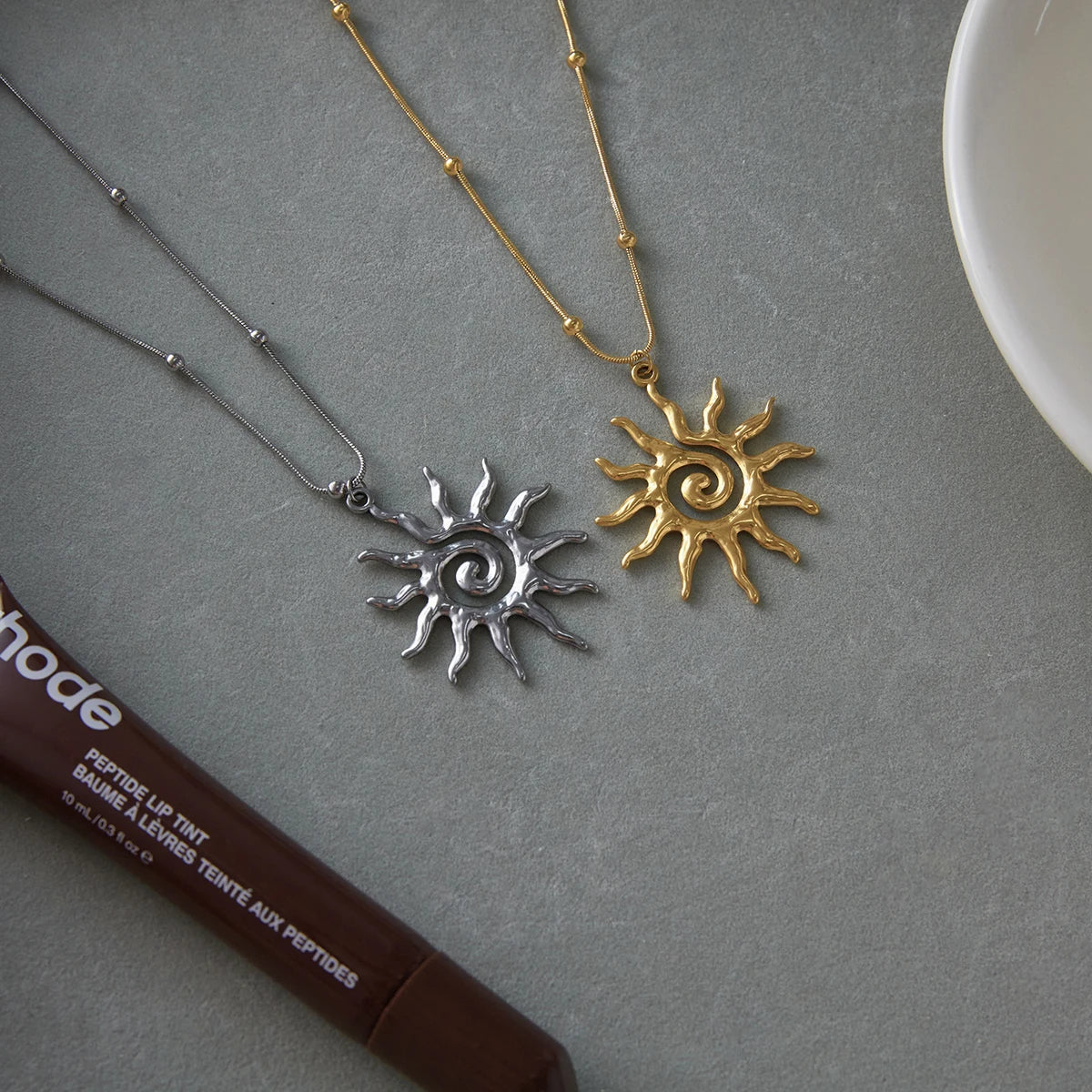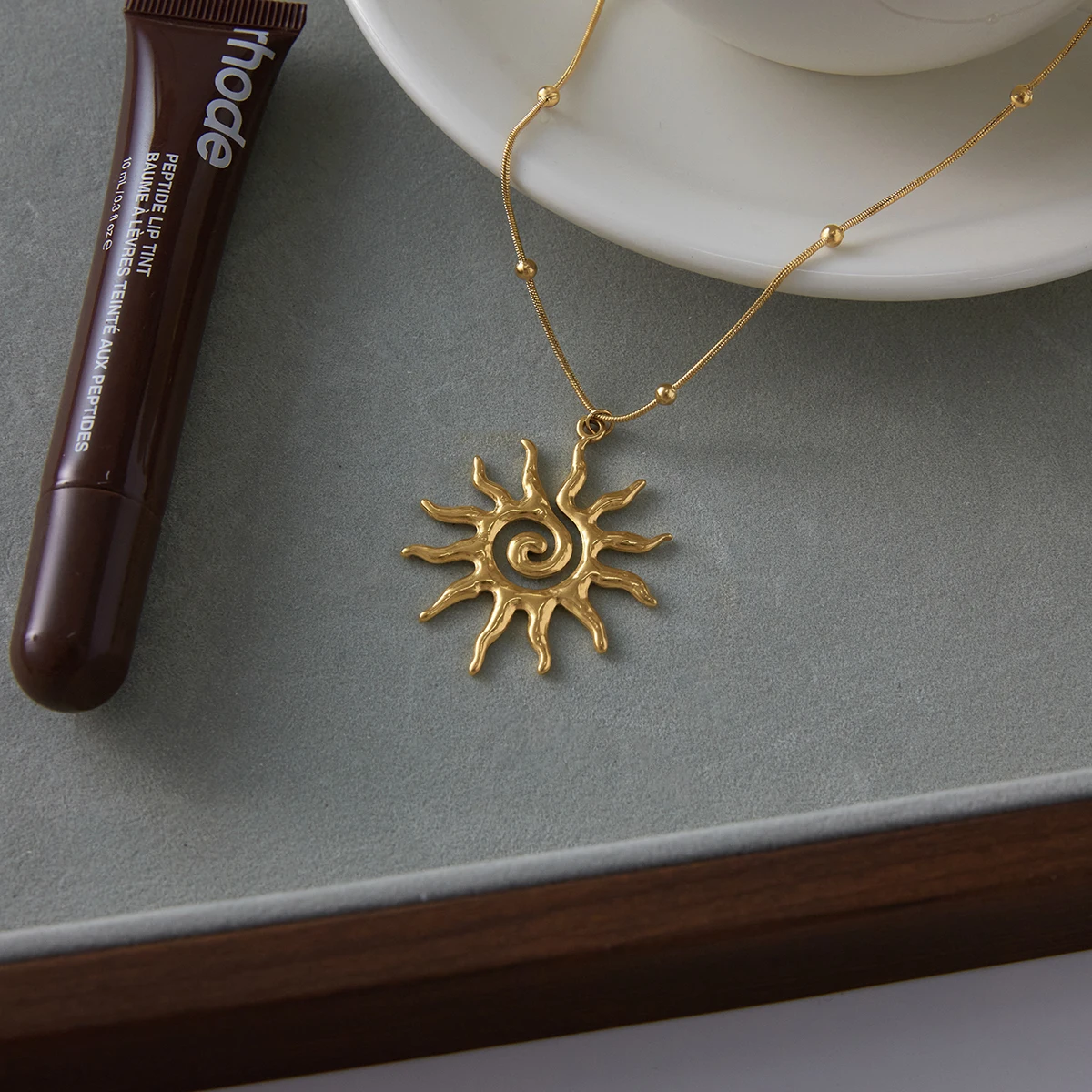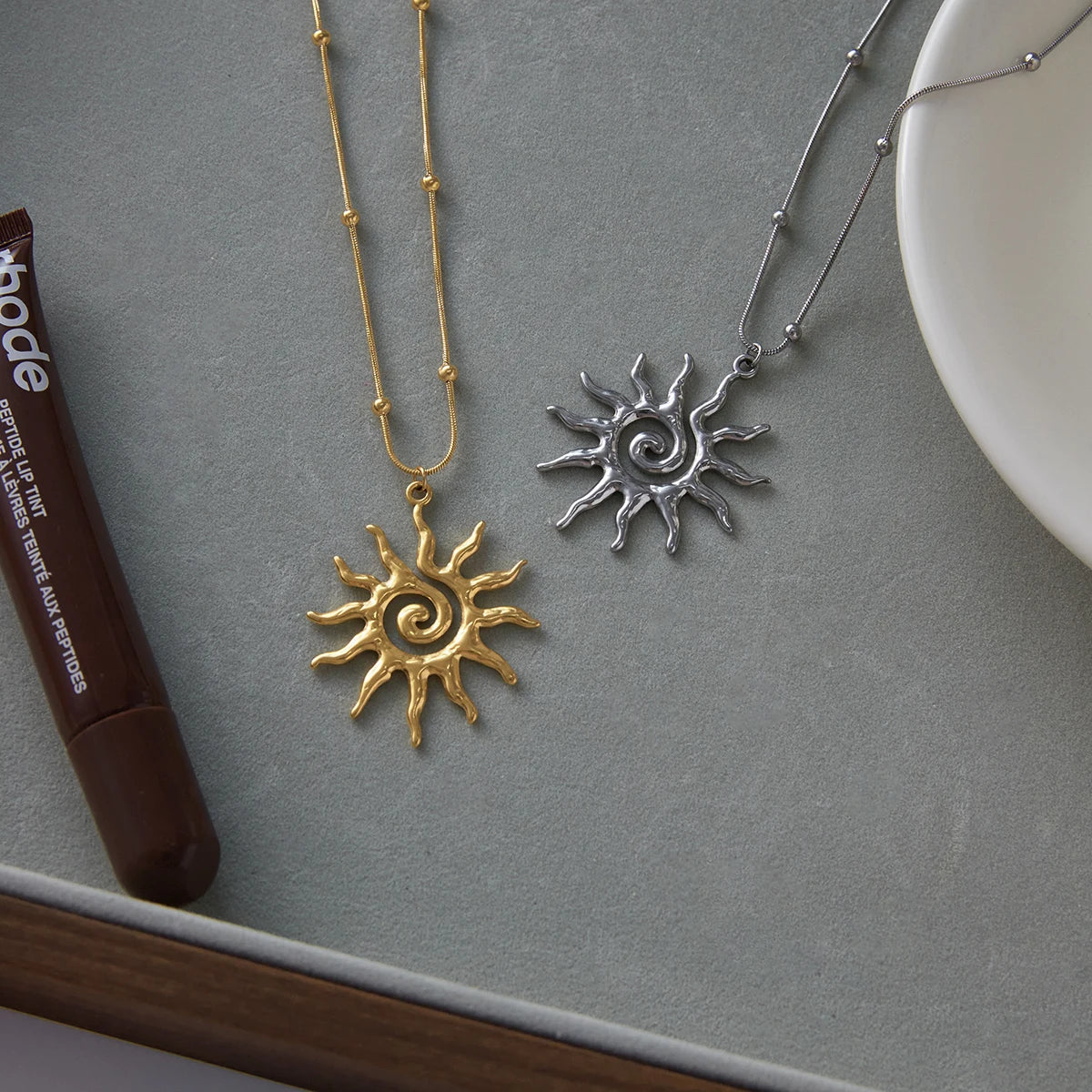 P010 Uworld Unique Trendy 18K Gold Color Plated Hammer Patterned Spiral Sun Pendant Necklace Stainless Steel Waterproof Women Jewelry